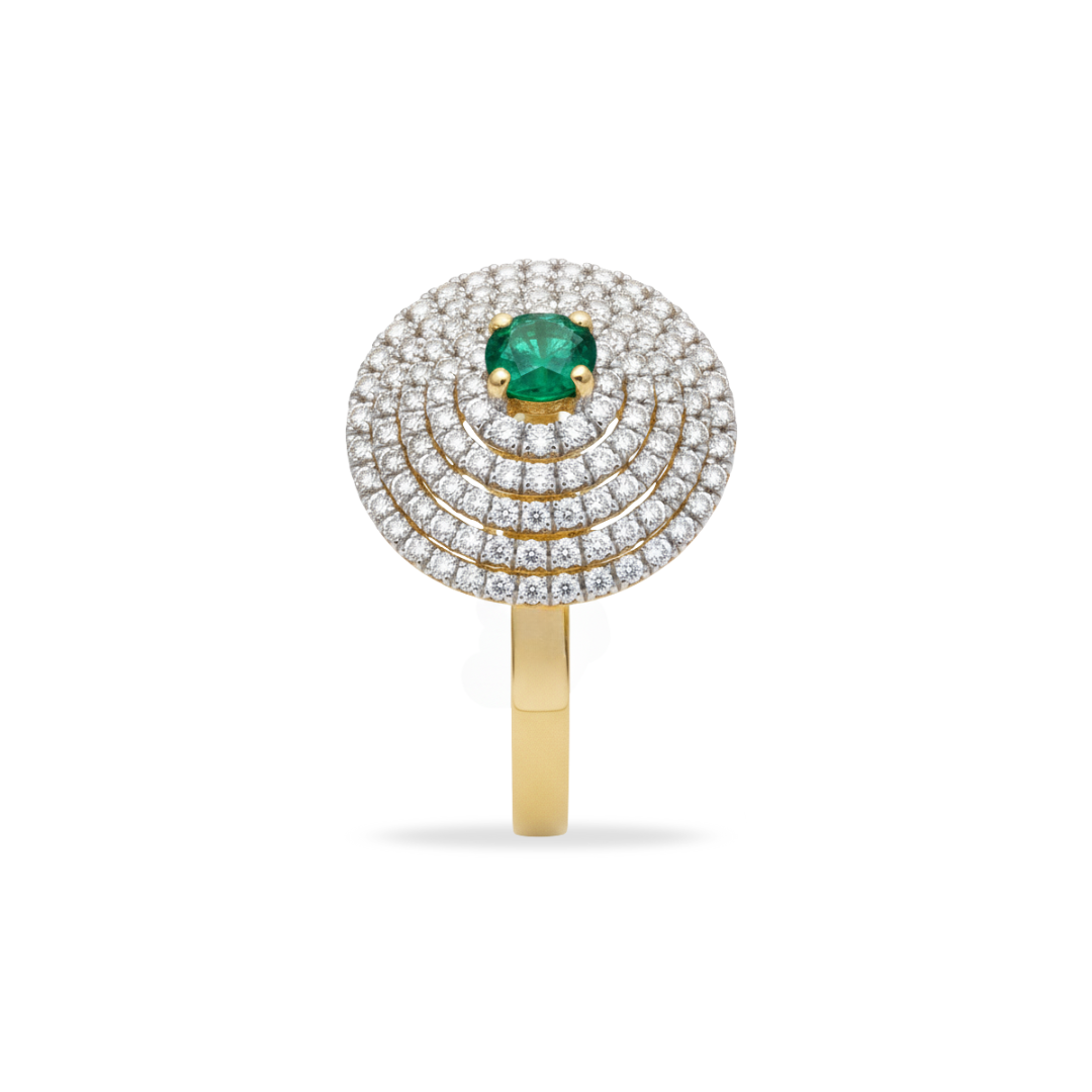 Jasmine cocktail gemstone ring in 18KT & 14KT Gold. This cocktail ring features modern elevated look encrusted with sparkling round diamonds on side and green stone at the centre with an option to add a solitaire instead of stone. This ring is available in a range of metal options and your choice of natural or lab grown diamonds. We offer a free design service for any customised changes that you may require.