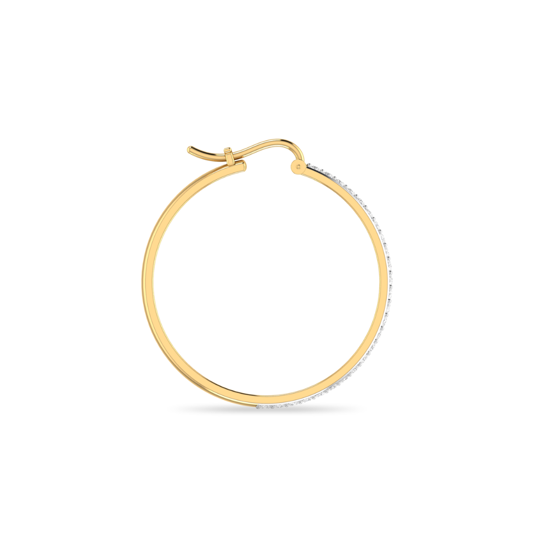 Kayle diamond hoop earrings in 18KT & 14KT Gold. This diamond earrings are showcasing the classic hoops pattern encrusted with sparkling round diamonds. Whether worn to be styled for your perfect office look or cherished as everyday sparkle, this classic design ensures your presense in check. This diamond earrings is available in a range of metal options and your choice of natural or lab grown diamonds. We offer a free design service for any customised changes that you may require.